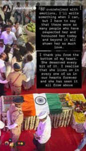 उन्होंने आगे अपने पोस्ट में लिखा, “मैं आप सभी का दिल से धन्यवाद करना चाहती हूं. वह इस सम्मान और प्यार की पूरी हकदार थीं. आज मुझे यह एहसास हुआ है कि वह हमारे बीच हमेशा मौजूद रहेंगी… हमारे दिलों में हमेशा जिंदा रहेंगी और ऊपर से हम सभी को देख रही हैं.”