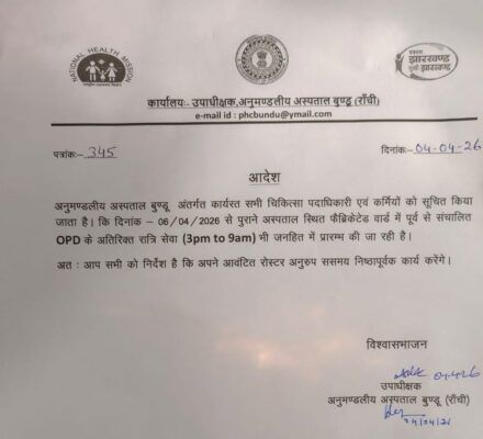 अस्पताल उपाधीक्षक ने सभी चिकित्सकों एवं स्वास्थ्य कर्मियों को सख्त निर्देश दिया है कि वे निर्धारित रोस्टर के अनुसार समय पर उपस्थित रहें और अपनी जिम्मेदारियों का पूरी निष्ठा के साथ निर्वहन करें, ताकि रात के समय किसी भी मरीज को आपातकालीन इलाज के लिए परेशानी का सामना न करना पड़े. यह पहल न केवल स्वास्थ्य सुविधाओं के विस्तार की दिशा में एक बड़ा कदम है, बल्कि बुंडू की जनता के विश्वास और उम्मीदों को भी नई मजबूती देने वाला निर्णय साबित होगा.