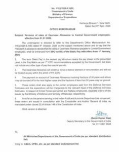 Delhi: केंद्रीय कर्मचारियों के लिए बड़ी राहत की खबर है. केंद्र सरकार ने महंगाई भत्ते को बढ़ाकर 60 प्रतिशत कर दिया है और इसके लिए औपचारिक आदेश भी जारी कर दिए गए हैं. यह संशोधित महंगाई भत्ता 1 जनवरी 2026 से प्रभावी माना जाएगा, जिससे कर्मचारियों को बकाया राशि का भी लाभ मिलेगा.