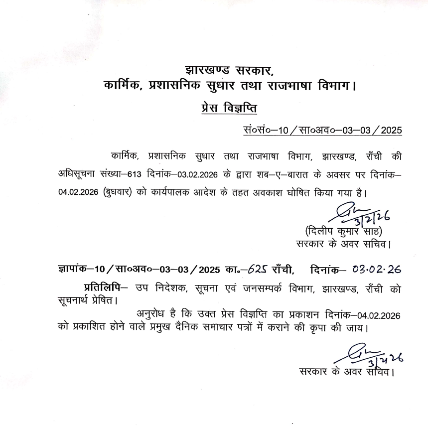रांची : झारखंड सरकार ने शब-ए-बरात के अवसर पर 4 फरवरी 2026 (बुधवार) को अवकाश घोषित किया है। यह छुट्टी कार्यपालक आदेश के तहत घोषित की गई है। इस संबंध में कार्मिक, प्रशासनिक सुधार एवं राजभाषा विभाग ने मंगलवार को आधिकारिक आदेश जारी कर दिया।