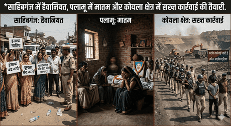 रांची: झारखंड के अलग-अलग जिलों से बीते 24 घंटों में कई बड़ी खबरें सामने आई हैं.साहिबगंज में जहां मानवता को शर्मसार करने वाली घटना घटी, वहीं पलामू में एक सड़क हादसे ने मासूम की जान ले ली. दूसरी ओर, राज्य के आर्थिक मोर्चे पर बीसीसीएल ने कड़ा रुख अपनाया है और पूर्वी सिंहभूम में पुलिस ने एक अनैतिक देह व्यापार गिरोह का भंडाफोड़ किया है.