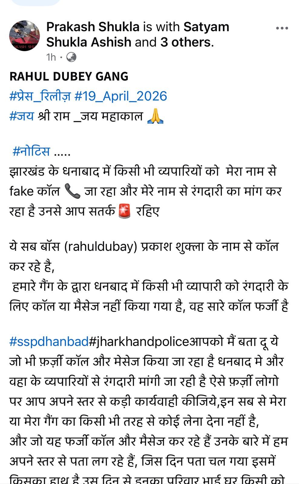 विज्ञप्ति में कहा गया है कि धनबाद के व्यापारियों को मेरे और प्रकाश शुक्ला के नाम से फर्जी कॉल कर रंगदारी मांगी जा रही है. इन फर्जी लोगों से सतर्क रहने की जरूरत है. क्योंकि इससे हमारा इनसे कोई लेना-देना नहीं है.