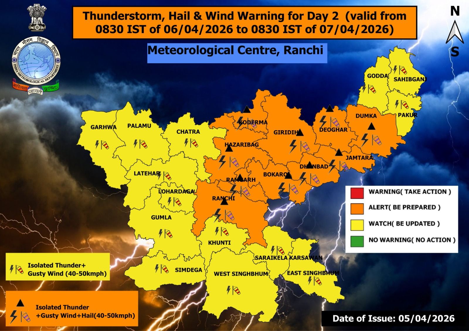 मौसम विभाग ने 5 से 9 अप्रैल के बीच कई जिलों के लिए चेतावनी जारी की है. इस दौरान 40 से 60 किमी प्रति घंटे की रफ्तार से तेज हवा चल सकती है. गरज के साथ वज्रपात (Lightning) की संभावना है. कुछ क्षेत्रों में ओलावृष्टि भी हो सकती है. 6 और 7 अप्रैल को उत्तर-पूर्वी और दक्षिण-पूर्वी झारखंड में ओलावृष्टि की आशंका जताई गई है.