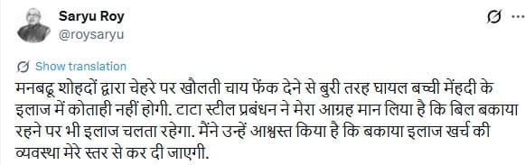 विधायक सरयू राय ने इस घटना पर गहरा दुख व्यक्त किया है. उन्होंने सोशल मीडिया प्लेटफॉर्म एक्स पर अपनी प्रतिबद्धता जाहिर करते हुए स्पष्ट किया कि पीड़ित बच्ची के इलाज में धन की कोई कमी आड़े नहीं आने दी जाएगी.