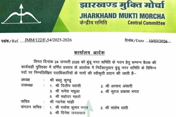 बुंडू: झारखंड मुक्ति मोर्चा (झामुमो) की केंद्रीय समिति ने बुंडू नगर समिति के गठन को लेकर कार्यालय आदेश जारी किया है. जारी आदेश के अनुसार 24 जनवरी 2026 को बुंडू में आयोजित बैठक में पारित प्रस्ताव के आलोक में नगर समिति के विभिन्न पदों पर पदाधिकारियों के नामों को स्वीकृति प्रदान की गई है.