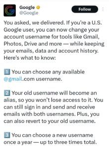 इस फीचर की जानकारी Google ने अपने आधिकारिक(पहले ट्विटर) अकाउंट के जरिए साझा की. कंपनी के अनुसार, अमेरिका में Gmail यूजर्स अब अपना @gmail.com यूजरनेम बदल सकते हैं, बिना डेटा खोए.