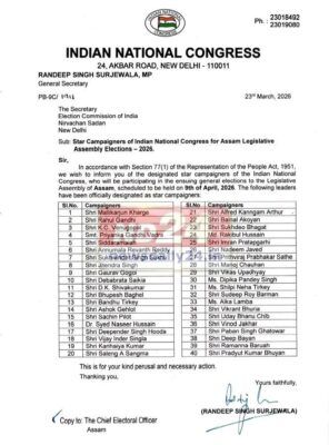 Ranchi: असम विधानसभा चुनाव के लिए कांग्रेस ने अपने स्टार प्रचारकों की सूची जारी कर दी है. कांग्रेस के जेनरल सेक्रेट्री रणदीप सिंह सुरजेवाला के हस्ताक्षर से यह सूची जारी की गई है. इसमें झारखंड की ओर से प्रदेश कांग्रेस कार्यकारी अध्यक्ष बंधु तिर्की, सांसद सुखदेव भगत को स्टार प्रचारक के लिए नामित किया गया है. साथ ही झारखंड सरकार में कैबिनेट मंत्री दीपिका पांडेय सिंह और शिल्पी नेहा तिर्की भी स्टार प्रचारकों की सूची में शामिल किया गया है.
