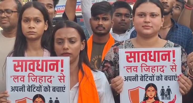 Ranchi: अल्बर्ट एक्का चौक आज नारों और विरोध प्रदर्शन से गूंज उठा. बजरंग दल, विश्व हिंदू परिषद और हिंदू समाज के विभिन्न संगठनों ने एकजुट होकर जिहादी मानसिकता के खिलाफ जोरदार प्रदर्शन किया और पुतला दहन किया. यह विरोध प्रदर्शन मुख्य रूप से राज्य में बढ़ते लव जिहाद के मामलों और महिलाओं के खिलाफ हो रहे अपराधों के विरोध में आयोजित किया गया था. प्रदर्शन के दौरान महिला और पुरुष कार्यकर्ता हाथों में तख्तियां और कट-आउट्स लिए नजर आए. इस दौरान कार्यकर्ताओं ने ‘लव जिहाद’ के खिलाफ जमकर नारेबाजी की.