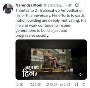 इसके बाद प्रधानमंत्री Narendra Modi ने उन्हें नमन करते हुए कहा कि अंबेडकर का जीवन और उनके कार्य आज भी देश को न्यायपूर्ण और प्रगतिशील समाज बनाने के लिए प्रेरित करते हैं.