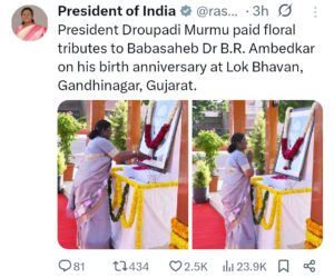 सबसे पहले राष्ट्रपति Droupadi Murmu ने गांधीनगर के लोक भवन में बाबासाहेब को पुष्पांजलि अर्पित की और उनके विचारों को देश के लिए प्रेरणादायक बताया.