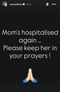 पिछले कुछ महीनों से जरीन खान अपने सोशल मीडिया प्लेटफॉर्म्स पर मां की सेहत से जुड़ी जानकारी शेयर कर रही थीं और फैंस से उनके लिए दुआ करने का अनुरोध कर रही थीं. पिछले महीने ही परवीन खान को अस्पताल में भर्ती कराया गया था. जरीन ने इंस्टाग्राम स्टोरी में लिखा था, “मां को दोबारा अस्पताल में भर्ती कराया गया है. कृपया उनके लिए प्रार्थना करें.”