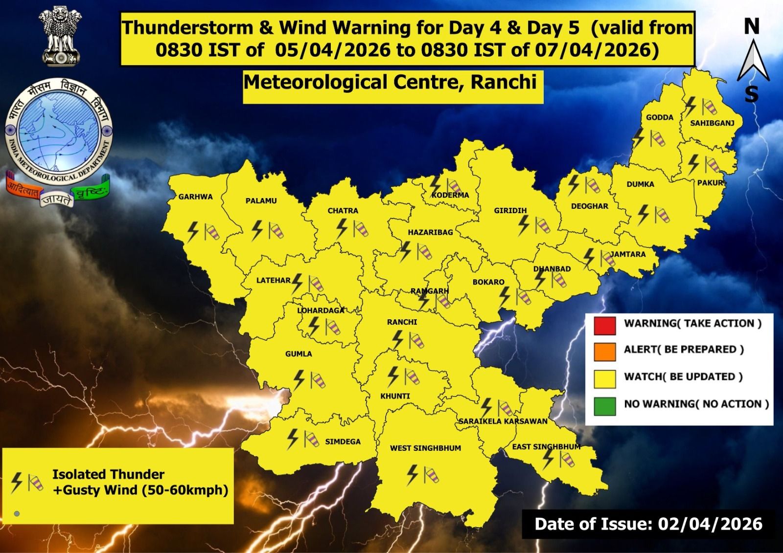 Ranchi: मौसम विभाग ने राज्य के कई जिलों के लिए तात्कालिक मौसम चेतावनी जारी की है. जारी अलर्ट के अनुसार पूर्वी सिंहभूम, लोहरदगा, रांची और साहेबगंज के कुछ हिस्सों में अगले एक से तीन घंटे के भीतर मौसम अचानक बदल सकता है. मौसम विभाग के अनुसार इन क्षेत्रों में हल्के से मध्यम दर्जे की वर्षा के साथ मेघ गर्जन और वज्रपात की संभावना है. इसके साथ ही कुछ स्थानों पर 30 से 40 किलोमीटर प्रति घंटे की रफ्तार से तेज हवाएं चल सकती हैं, जिससे जनजीवन प्रभावित होने की आशंका है. मौसम विभाग ने इसे ‘येलो वार्निंग’ श्रेणी में रखते हुए लोगों को सतर्क रहने की सलाह दी है. विभाग के मुताबिक, खुले स्थानों पर रहने से बचें और खराब मौसम के दौरान सुरक्षित स्थानों पर शरण लें.